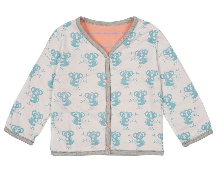 Eine Seite ist aus bedrucktem Jersey, die andere Seite aus geringeltem Interlock gefertigt. Alle Kanten sind kontrastfarbig eingefasst. Vorne mit Druckknopfverschluss.