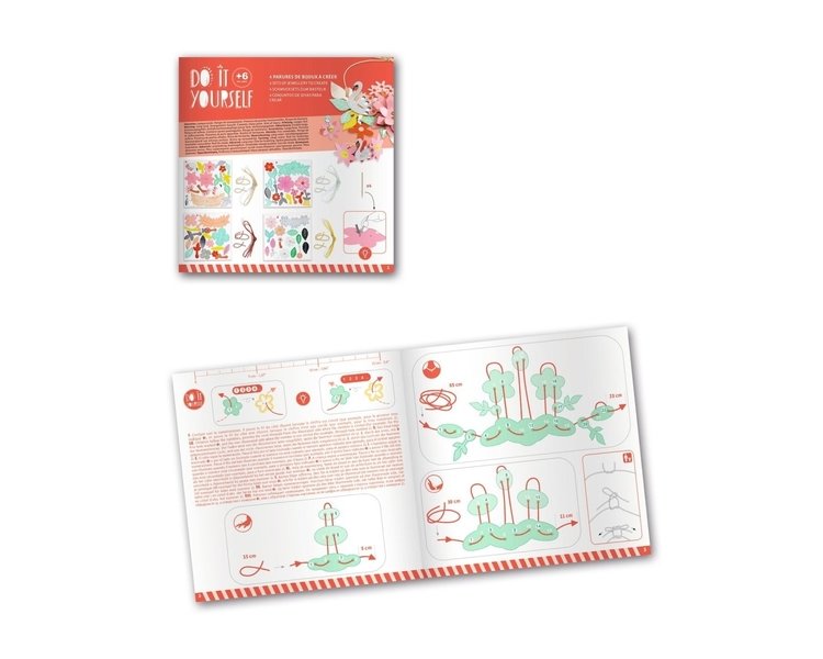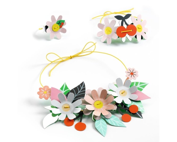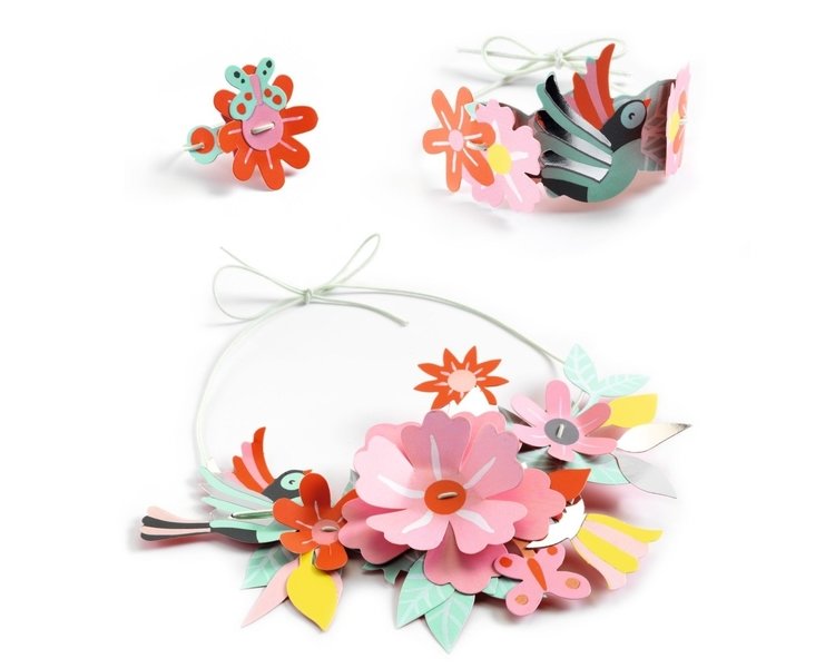 Ein Kreativset zum Basteln von 4 Schmucksets aus Papier mit frischen floralen Elementen. Jedes Set besteht aus einem Ring, einem Armband und einer Halskette.